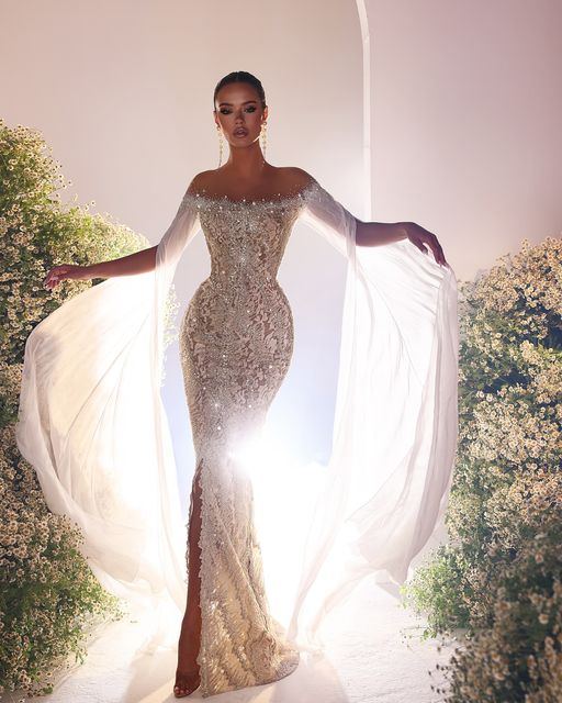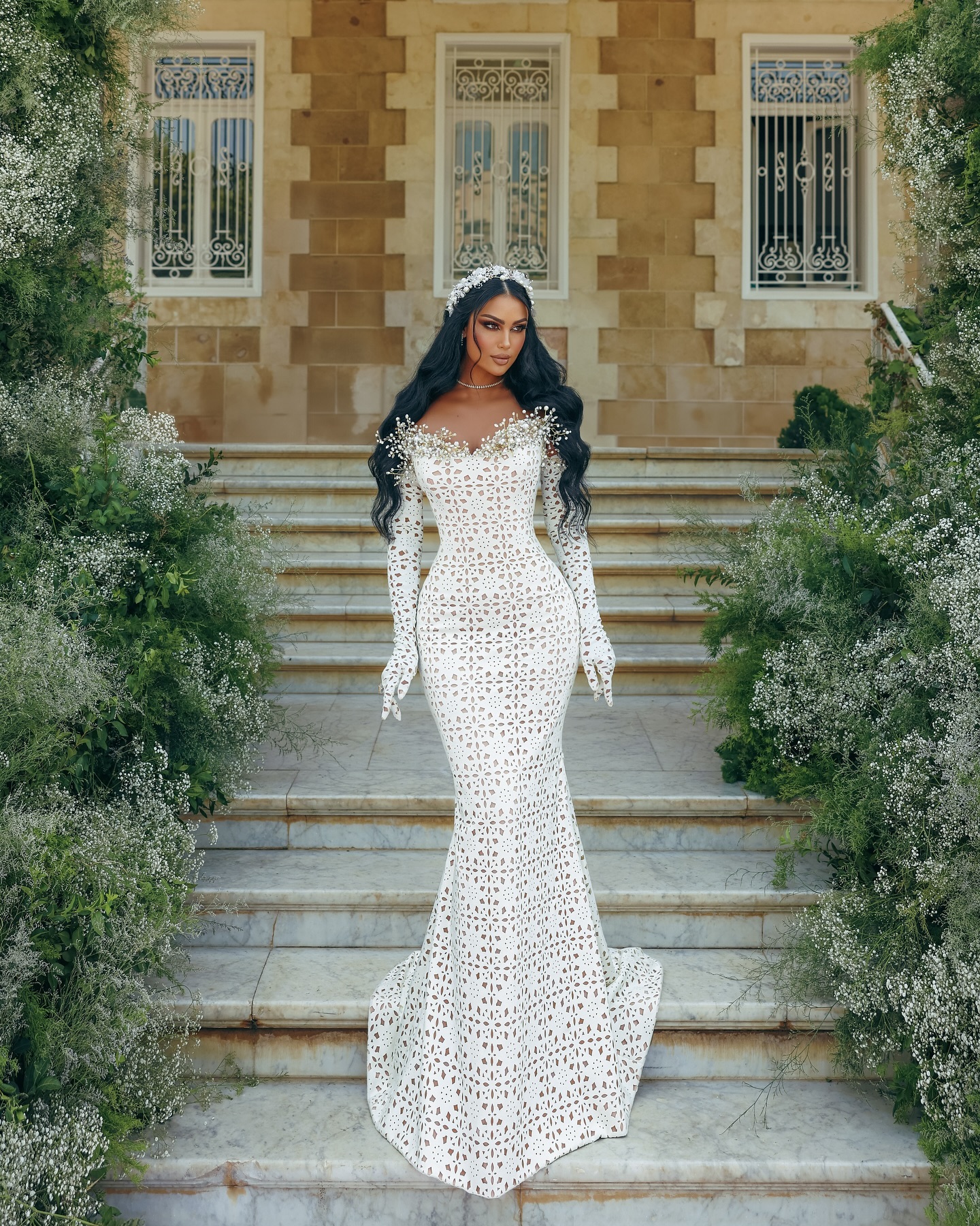 في ثوب العرس قص القماش وخرمه كقطعة ماسية أعطاه ذاك التخريم الماسي المسدس وزينه بالماس فأتت الفخامة صارخة والابتكار أكبر من أن يوصف.