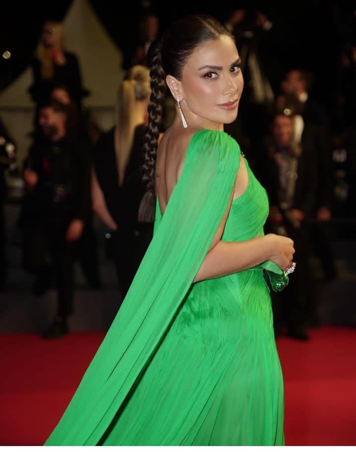 حلة الأخضر التي ازدانت بها صبا مبارك على وقع الحرائر وجمال الأميرات. ضمت شعرها الطويل على شكل ضفيرة أنيقة فاستبان الوجه بسمرته الجذابة وخلفها شلالات الحرير الأخضر تتدفق.