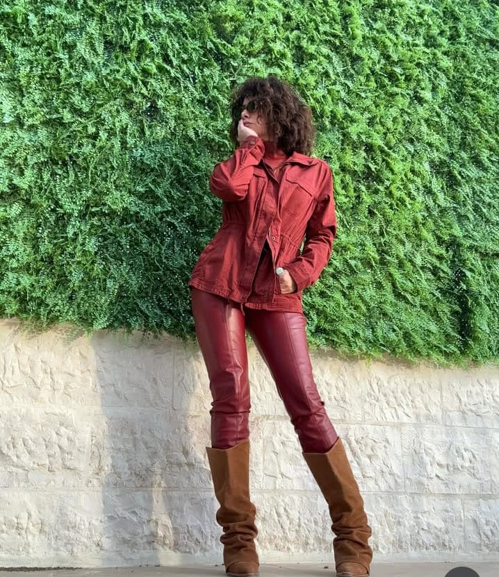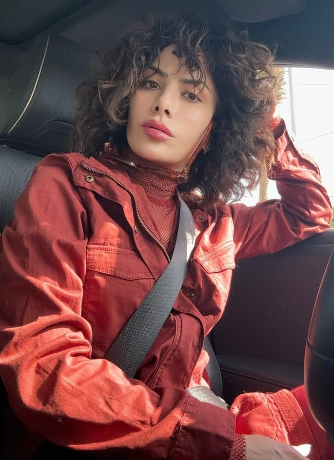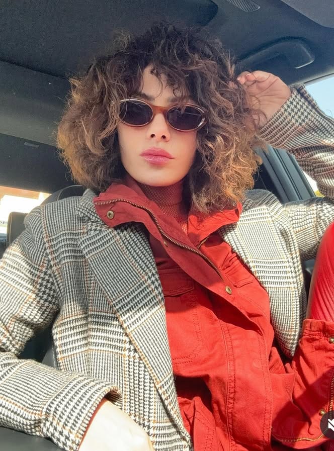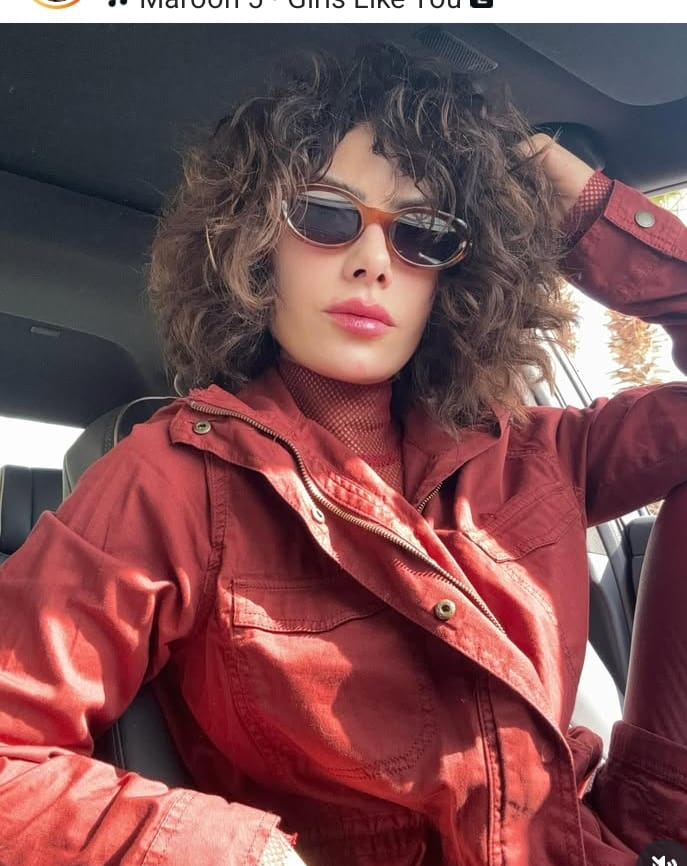 إطلالة مبارك جاءت متطرفة باللون البني الفاتح بملامح عميقة وهي داخل سيارتها وكأنها ترنو نحو البعيد في نظرات حزينة وحالمة ومنتظرة أو غامضة مع نظارتها الشمسية.