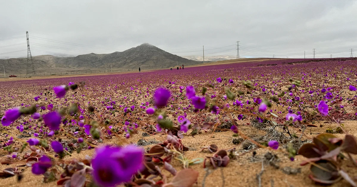 في صحراء أتاكاما، أكثر الصحاري جفافاً على كوكب الأرض، الواقعة في تشيلي، تزينت الكثبان الرملية بزهور بيضاء وبنفسجية في الأيام القليلة الماضية بعد أمطار مبكرة أحيت زهوراً في عز فصل شتاء نصف الكرة الأرضية الجنوبي.