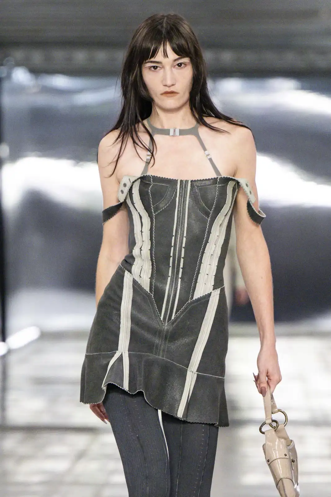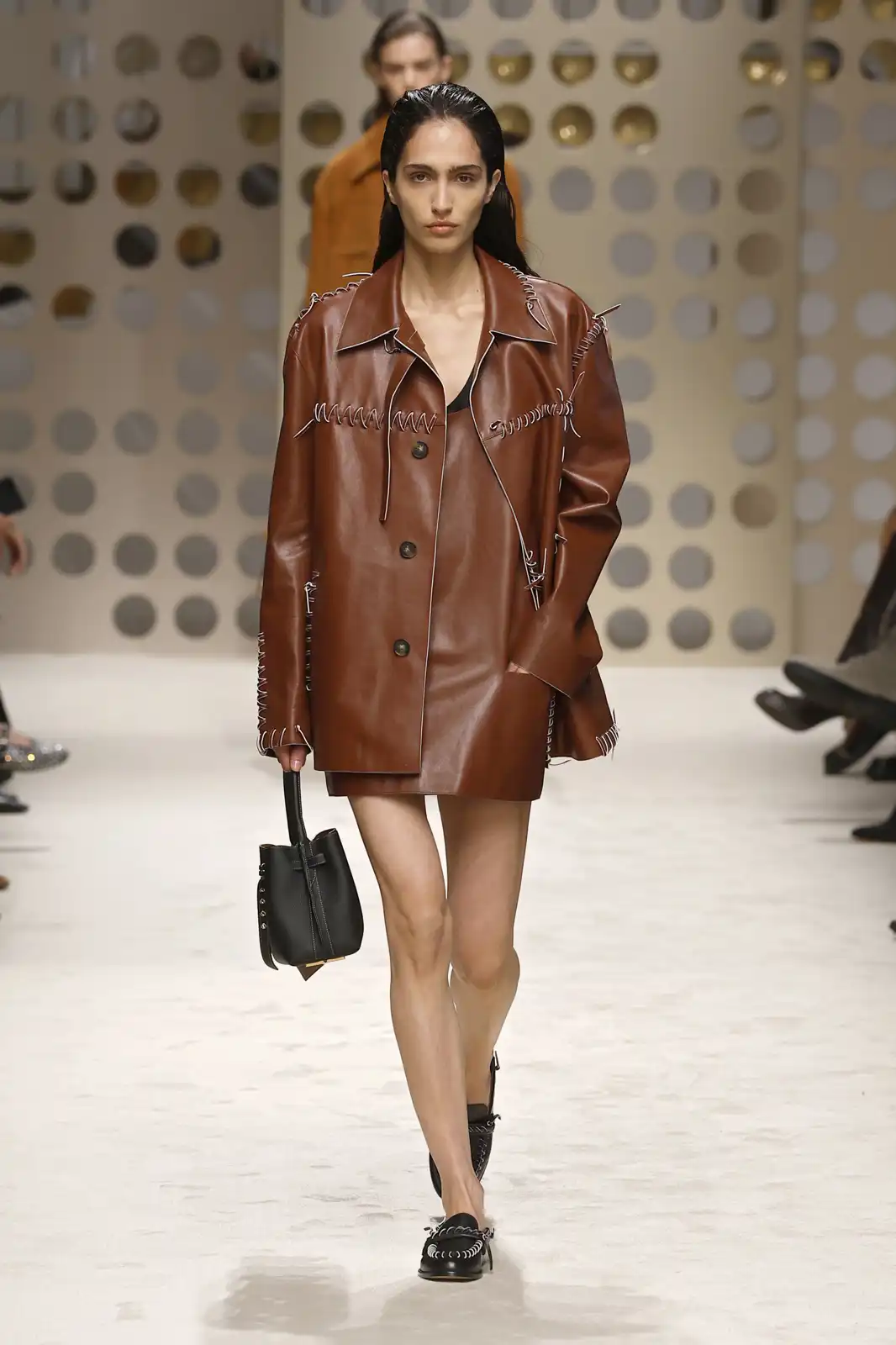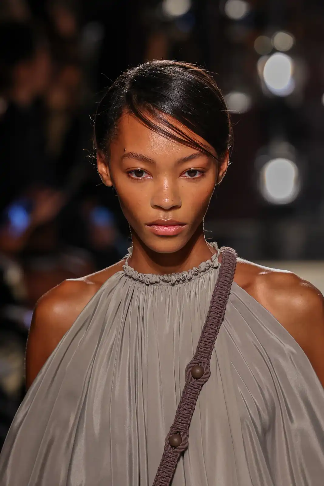 اختارت تودز في عرضها تسريحة الشعر المبلّل والمسحوب إلى الخلف ضمن أكثر من إطلالة. هذه التسريحة تُبرز ملامح الوجه بوضوح وتمنح المظهر لمسةً عصرية متجدّدة. ولإضافة طابع أكثر حيوية، يمكن اعتماد تموّجات خفيفة مسحوبة عند حدود الأذنين لتمنح الشعر لمسة طبيعية. ولثباتٍ يدوم، يُنصح باستخدام سبراي خفيف لتثبيت الشعر كلمسة نهائية.
