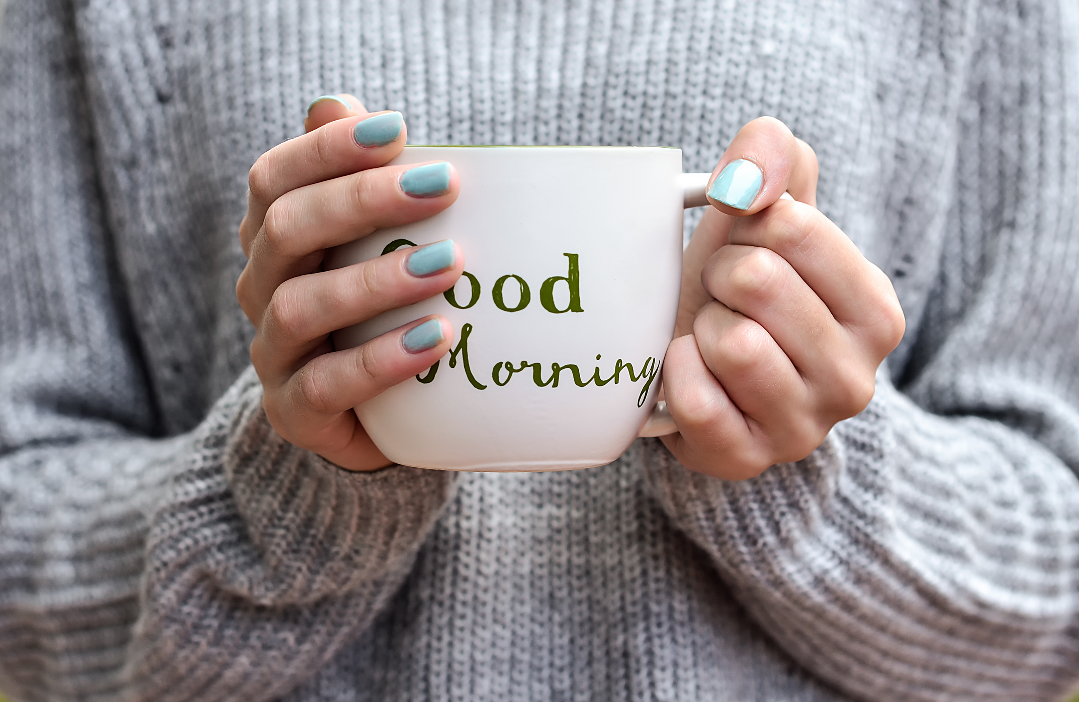 Close up of girl’s hands holding a cup of coffee with “good morning” printed on it.
