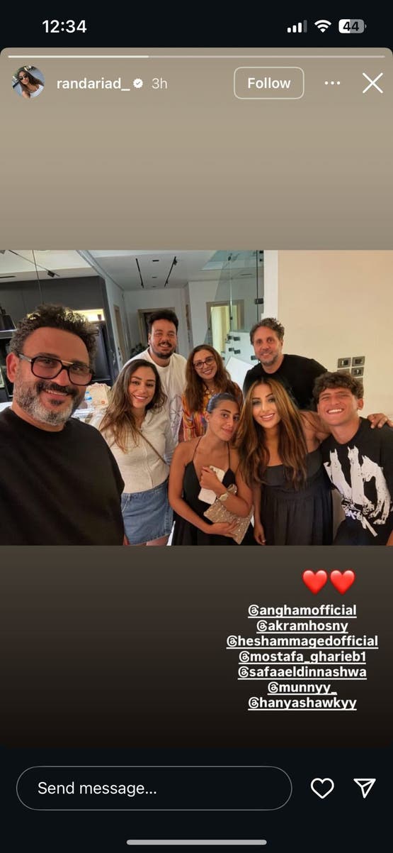 ونشرت راندا رياض مديرة أعمال الفنانة أنغام، صورة جديدة عبر خاصية “القصص القصيرة”، اليوم الأحد، على حسابها بموقع إنستغرام، تظهر أنغام رفقة نجلها وكل من الفنانين أكرم حسني وهشام ماجد ومصطفى غريب وآخرين، فيما لم تذكر مكان التقاط الصورة أو مناسبتها.