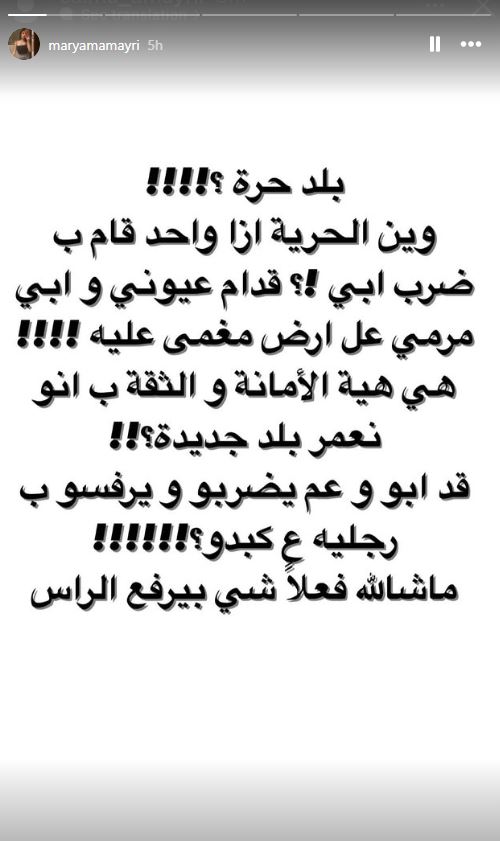 وكتبت مريم عبر خاصية القصص المصورة على صفحتها الخاصة على موقع انستغرام مجموعة من الرسائل التي روت فيها تفاصيل ما حصل، وقالت: “بلد حرة؟ وين الحرية ازا واحد قام بضرب ابي قدام عيوني وابي مرمي على الأرض مغمى عليه! هي هي الأمانة والثقة بإنه نعمر بلد جديدة، قد أبوه وعم يضربوا ويرفسو برجليه عكبدو! ماشاءالله فعلا شي بيرفع الراس”.