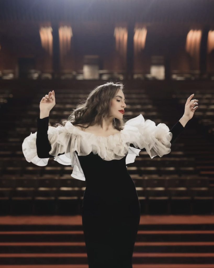 حضرت عبير بكامل أناقتها بذاك الثوب الأسود المخملي  الطويل ذات الكشاكش التي تلفها حول صدرها وعنقها وأطراف الجسد كأنها مغنية من زمن الاوبرا الإيطالي، والثوب الداكن يتهدل نحو الأرض بذيله الطويل.