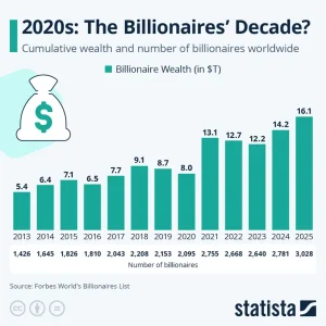 وفي عام 2025، ومع استمرار تأثر الأسواق بالاضطرابات العالمية وانعدام الأمن، شهدت ثروة المليارديرات ارتفاعاً ملحوظاً آخر.