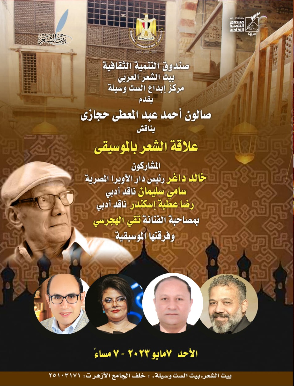 الدكتور خالد داغر رئيس دار الأوبرا المصرية والأستاذ بالكونسرفتوار والمؤلف الموسيقى المعروف، والدكتور سامي سليمان الناقد الأدبي والأستاذ بكلية الآداب جامعة القاهرة والناقد الأدبي دكتور رضا عطية الذي سيدير الصالون ويشارك فيه هذا إلى جانب المصاحبة الموسيقية للفنانة تقى الهجرسي وفرقتها الموسيقية ، جدير بالذكر أن بيت الشعر العربي يقيم فعالية ثقافية مساء كل أحد من كل أسبوع بشكل منتظم هذا إلى جانب تبنيه العديد من الأنشطة الشعرية التي تعزز حضور الشعر العربي ونشر ثقافته .