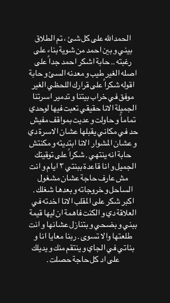 وكتبت علياء قائلة: الحمد لله على كل شيء تم الطلاق بيني وبين أحمد من شوية بناء على رغبته، حابة أشكر أحمد جدًا على أصله غير الطيب ومعدنه السئ وأحب أقوله شكرًا على قرارك اللحظي غير الموفق في خراب بيتنا وتدمير أسرتنا الجميلة اللي تعبت فيها لوحدي تمامًا وحاولت وعديت مواقف مفيش حد في مكاني يقبلها عشان الأسرة دي وعشان المشوار اللي أنا ابتديته ومكنتش حابة أنه ينتهي”.