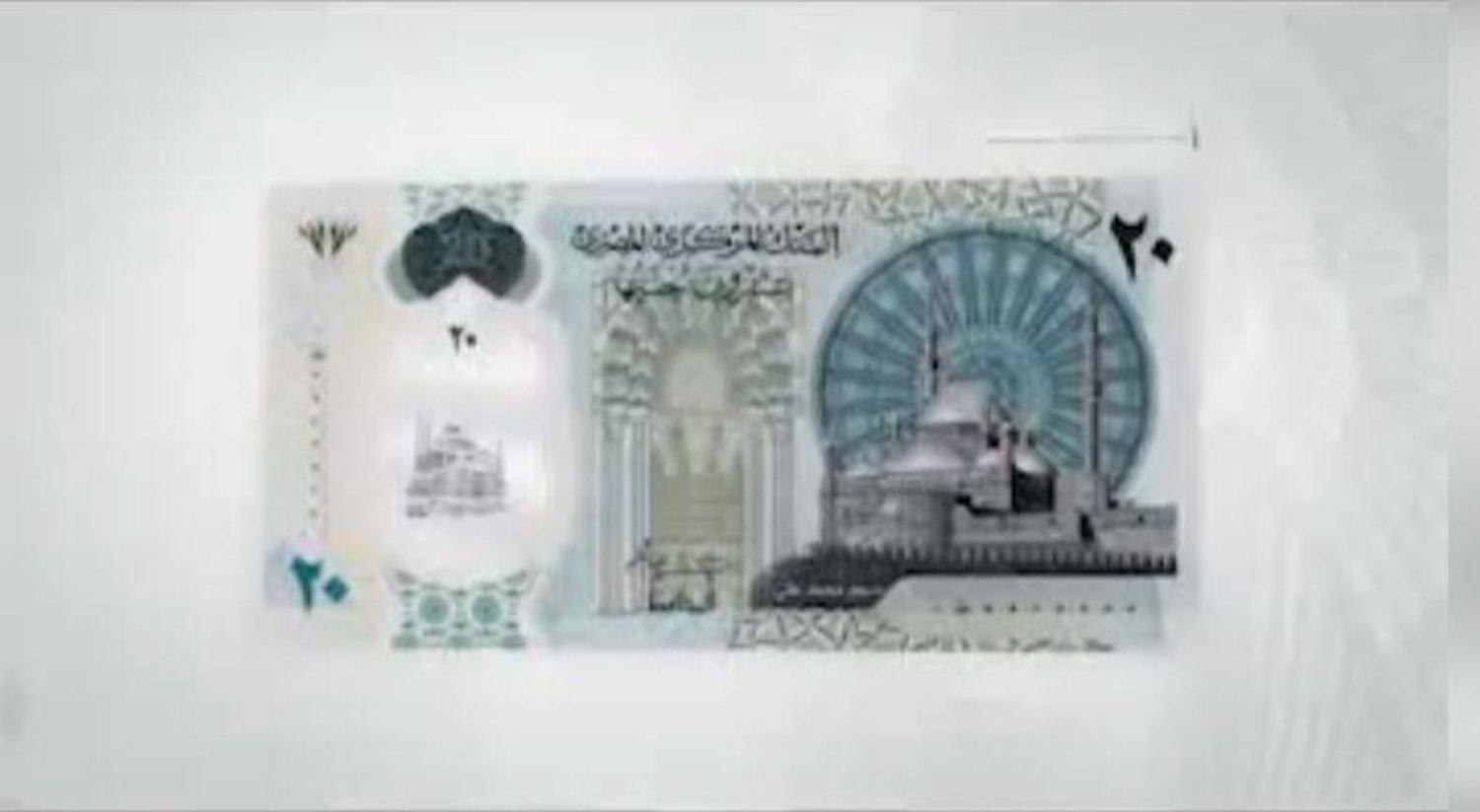 ويظهر على أحد أوجه العملة ذات العشرين جنيها مسجد محمد علي، وفي الوجه الآخر تظهر صورة للملكة كليوباترا ومجسم الهرم الأكبر من العصر الفرعوني، مع العجلة الحربية والمحارب المصري.
