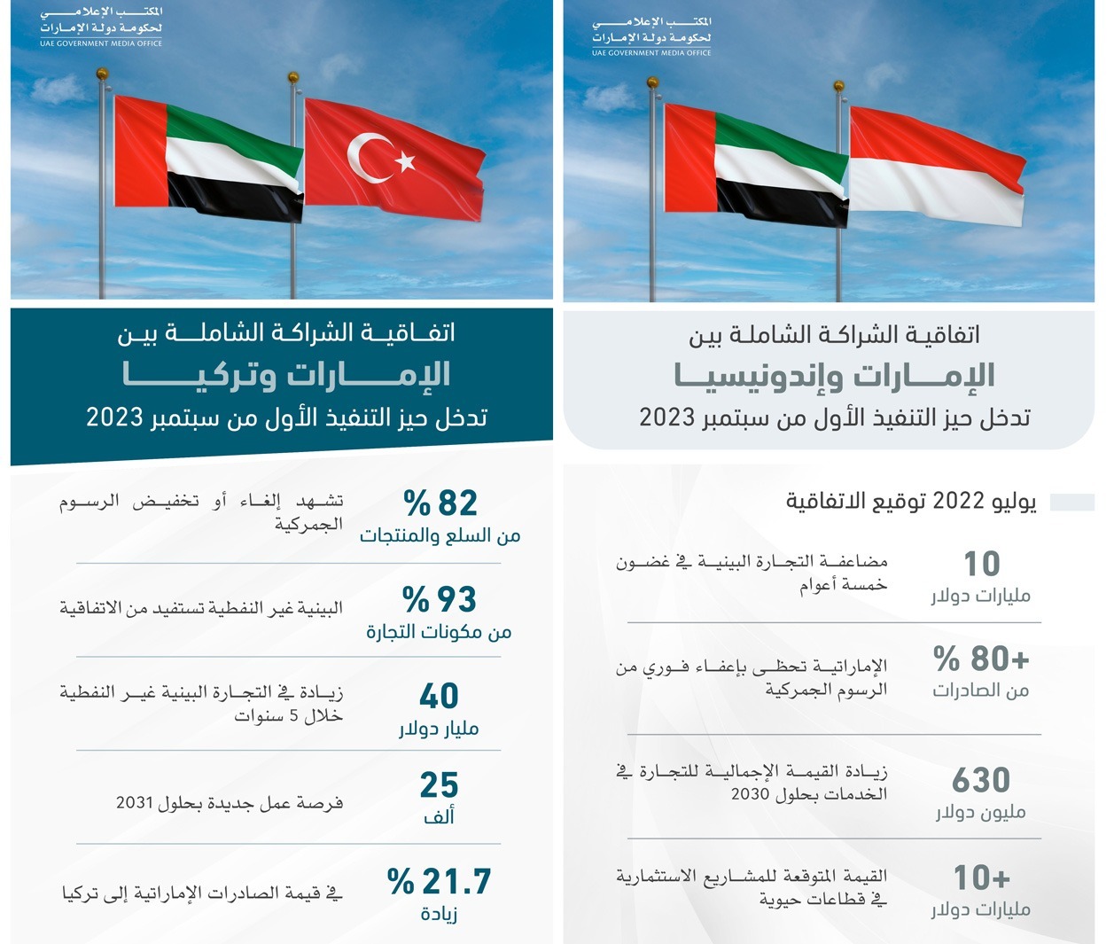 اعتباراً من الأول من سبتمبر 2023، تدخل اتفاقيتا الشراكة الاقتصادية الشاملة بين دولة الإمارات العربية المتحدة وكلا من جمهورية تركيا وجمهورية إندونيسيا حيز التنفيذ. هذا ما أكده “المكتب الإعلامي لحكومة دولة الإمارات“. مشيراً أن اتفاقيات الشراكة من شأنها فتح أسواق جديدة وتوفير فرصاً واعدة أمام الصادرات والاستثمارات الإماراتية في اثنين من أهم مناطق النمو الاقتصادي في العالم.