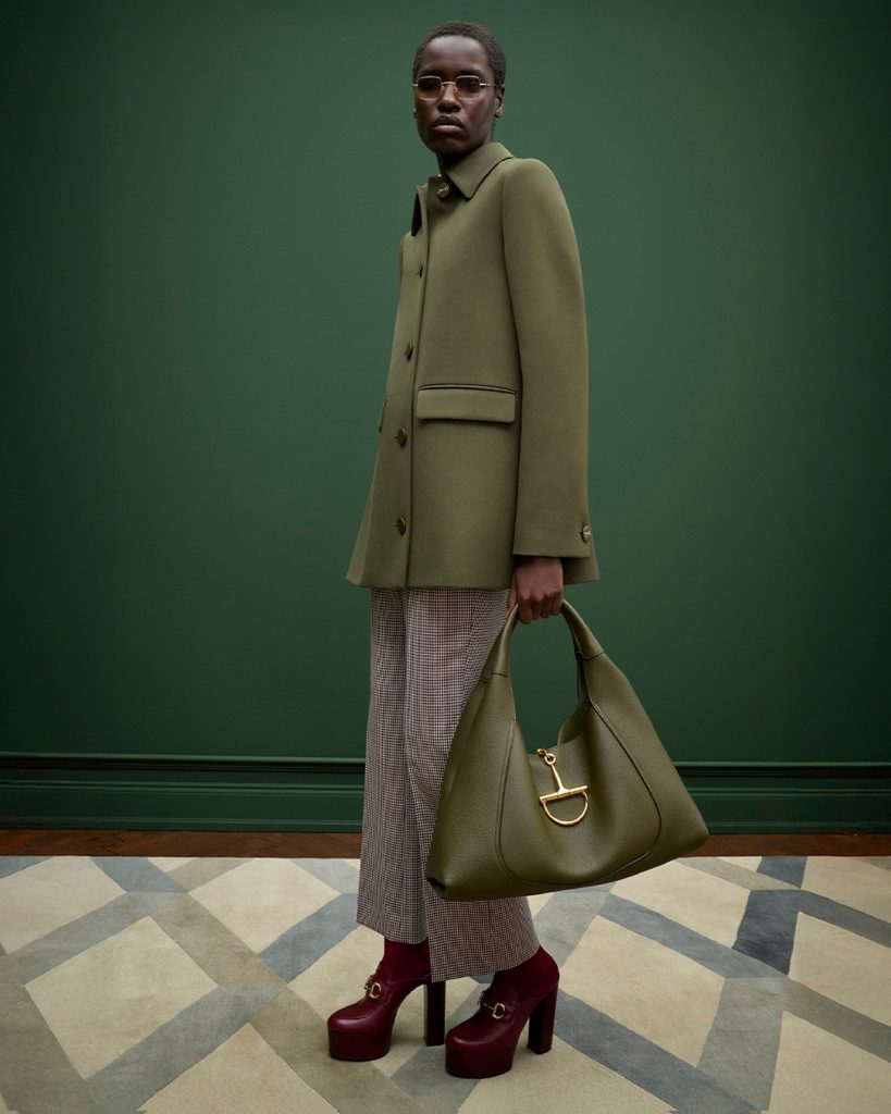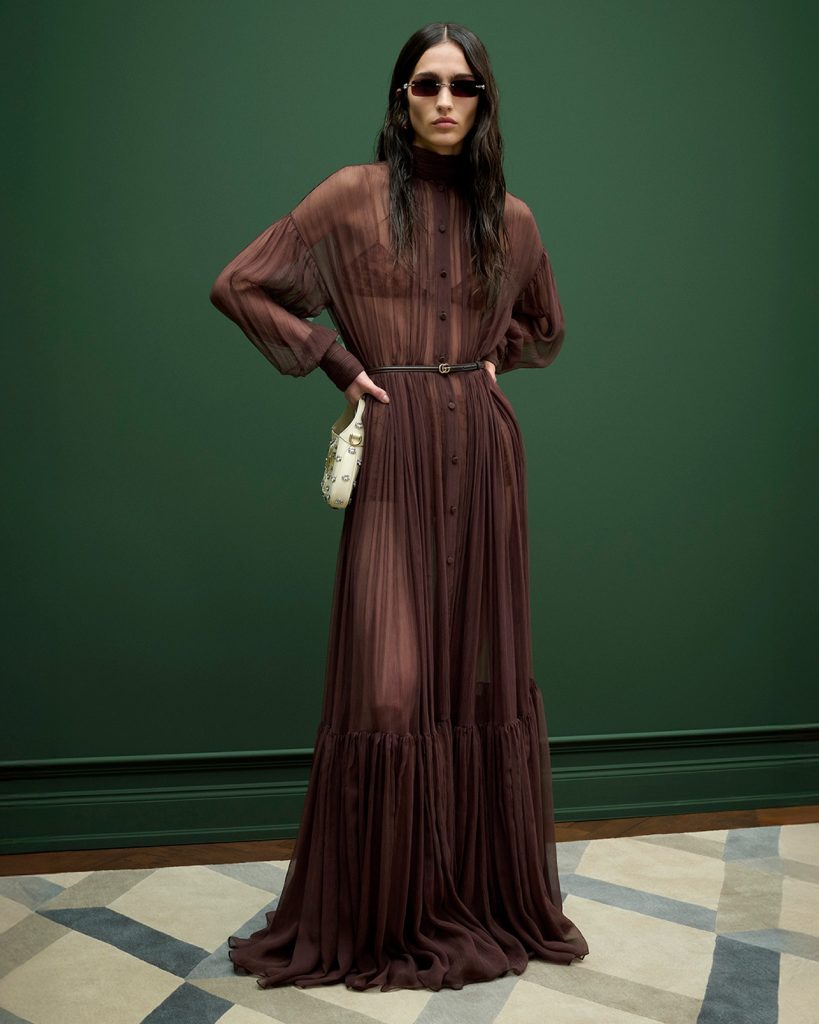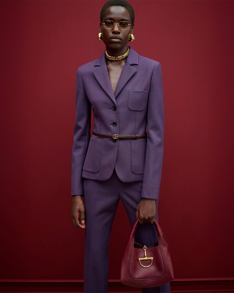 تلعب الخياطة دورا مركزيا في الملابس النسائية. توفر السترات الأنيقة المشدودة والحياكة المزخرفة مظهرا مصقولا ، بينما تضيف الأوشحة الجلدية لمسة من الحافة. لمزيد من المناسبات الرسمية، تقدم غوتشي فساتين بطول الأرض مع أقمشة شفافة وشقوق عالية، مما يضفي إحساسا ساحرا للغاية.وترك الازياء تقص نغمة كلاسيكية واضحة المعالم في السراويل واللمسات على الاقمشة الراكزة .