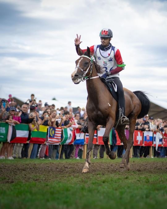 الفارس الشيخ ناصر بن حمد آل خليفة قائد الفريق الملكي البحريني حافظ على لقب المونديال بعد إحرازه المركز الأول على صهوة الجواد «أفيريست لا ماجوري» مسجلاً زمناً قدره 8.32.00 ساعة، لينال ذهبية منافسات الفردي للمرة الثانية على التوالي بعد نيله لقب النسخة الماضية في قرية بوذيب بالإمارات 2023.