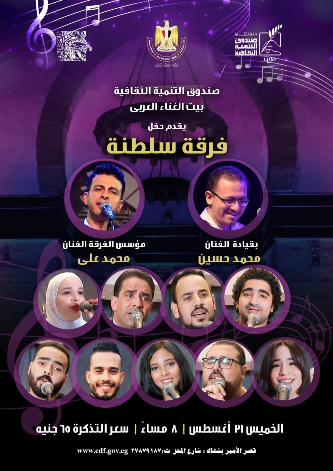 يقيم بيت الغناء العربي – قصر الأمير بشتاك – التابع لقطاع صندوق التنمية الثقافية فى تمام الثامنة من مساء الخميس القادم 31 أغسطس 2023 حفلًا غنائيًا لفرقة سلطنة بقيادة الفنان محمد حسين