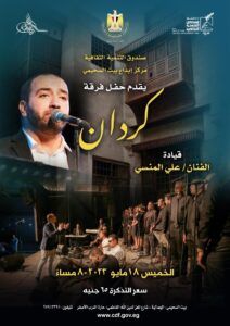 في تمام الثامنة من مساء الخميس القادم 18 مايو يستضيف مركز إبداع بيت السحيمي بشارع المعز بالقاهرة فرقة ” كردان ” للموسيقي والغناء بقيادة المايسترو علي المنسي.