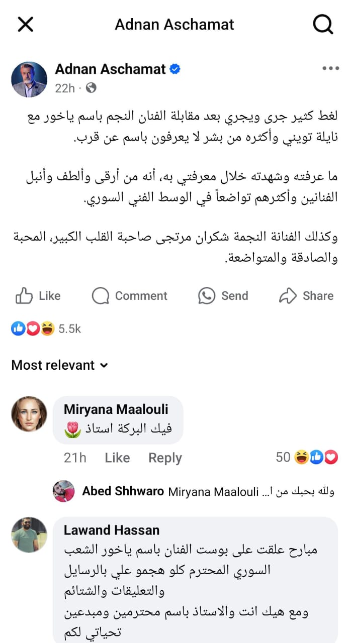 ودافع ممثلون سوريون عن ياخور، على غرار عدنان أبو الشامات الذي كتب في تدوينة على حسابه الرسمي في موقع “فيسبوك”: “لغط كثير جرى ويجري بعد مقابلة الفنان النجم باسم ياخور مع نايلة تويني وأكثره من بشر لا يعرفون باسم عن قرب”.