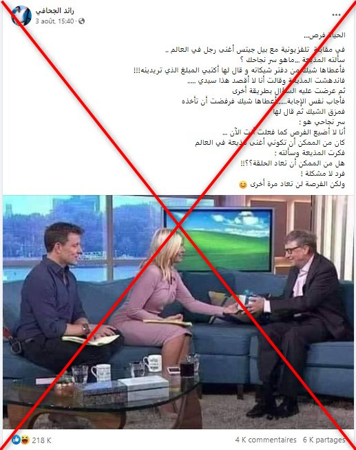 تنتشر منذ سنوات على مواقع التواصل بالعربية صور يدّعي ناشروها أنها تُظهر بيل غيتس، أحد أكبر أثرياء العالم، يعرض شيكاً برصيد مفتوح على مذيعة على الهواء تردّدت في قبوله ظنّاً بأنّه يمزح، فيما كان يقصد هو تعليمها عدم تضييع الفرص. لكن هذه القصّة من خيال مؤلفيها، والمقابلة التي تظهر في الصور المرافقة لم ترد فيها أي محادثة من هذا القبيل.