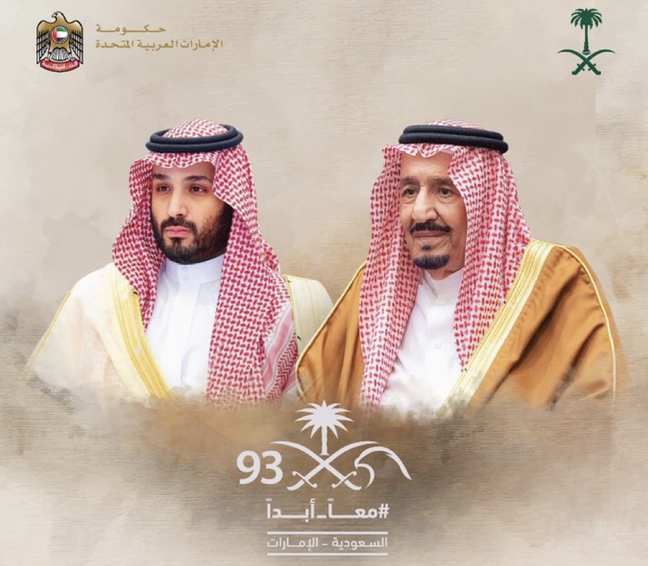 شارك صاحب السمو الشيخ محمد بن زايد آل نهيان رئيس دولة الإمارات العربية المتحدة، وصاحب السمو الشيخ محمد بن راشد آل مكتوم، خادم الحرمين الشريفين الملك سلمان بن عبدالعزيز، وولي العهد الأمير محمد بن سلمان، والشعب السعودي أفراحهم بمناسبة اليوم الوطني 93، متمنين للمملكة مزيداً من التنمية والتقدم والرخاء، ودوام الأمن والعز.