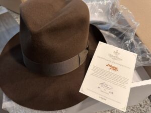 اعتمر القبعة دين فيرانديني، البديل للممثل الأميركي هاريسون فورد في فيلم Indiana Jones and the Temple of Doom أو “إنديانا جونز ومعبد الهلاك” الذي أنتجته هوليوود في 1984، وصنعتها شركة Herbert Johnson Hat Company مزينة بحشوات من الرغوة والأحرف الأولى من اسم إنديانا جونزI، وكانت جزءًا من مجموعة شخصية لفيرانديني الذي توفي العام الماضي.