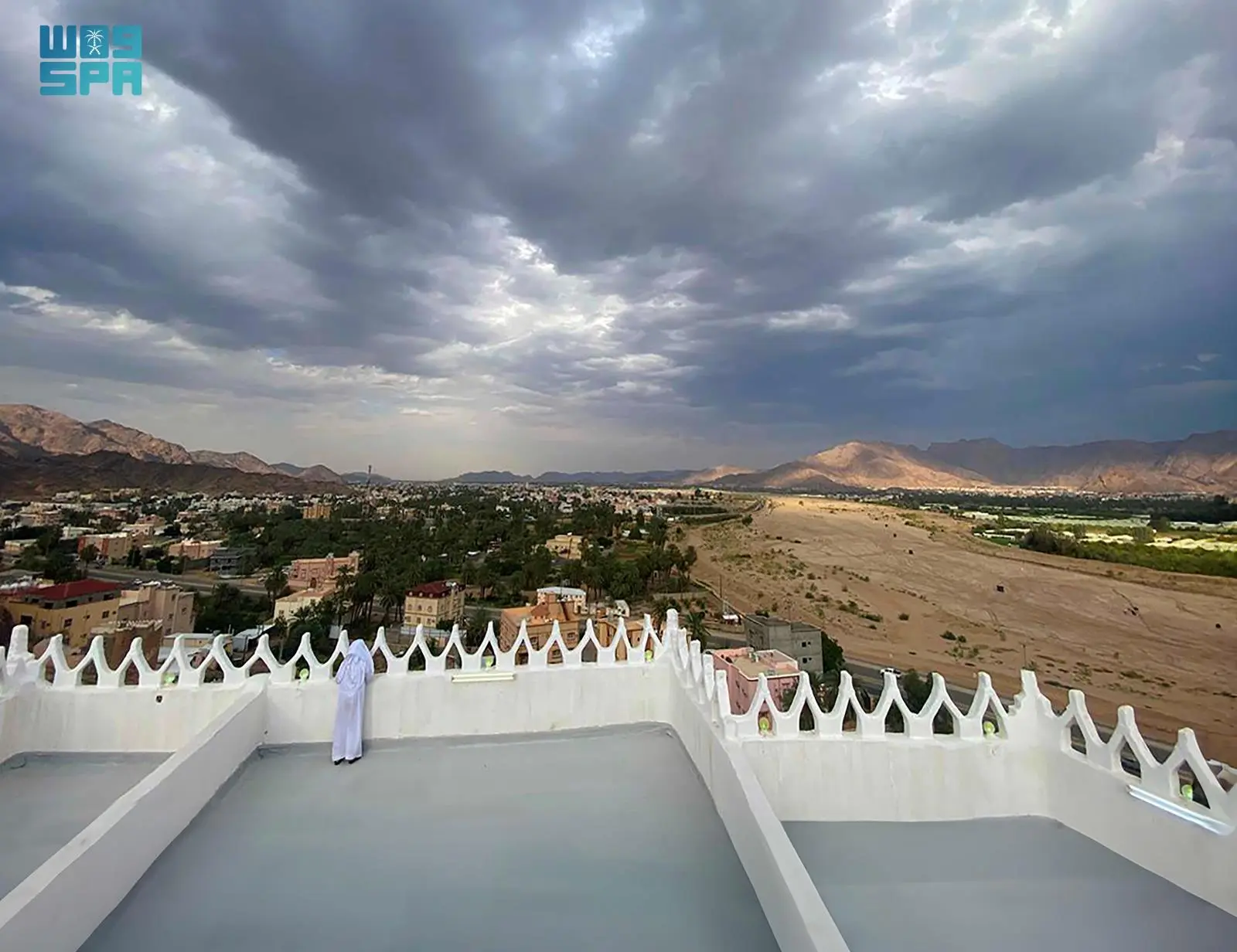 ويقع القصر الذي بُني عام 1100 هـ على جبل العان، حيث يشاهد الزائر عند صعوده للقصر مزارع النخيل، والقرى التراثية، وقلعة رعوم التاريخية، وجبل أبو همدان في صورة تعكس إطلالة ساحرة ومميزة، وشكلت مع الطراز المعماري الحديث لوحة آسرة وغاية في الجمال وفق وكالة الأنباء السعودية “واس”.