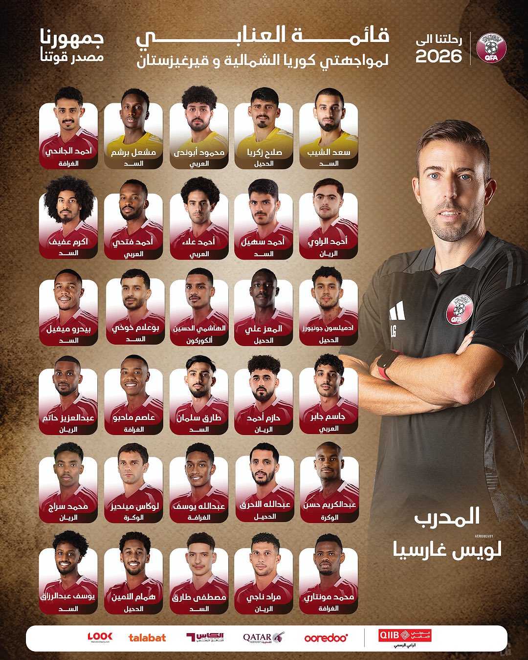 أعلنت قطر عن تشكيلة من 30 لاعباً لمواجهة كوريا الشمالية وقيرغيزستان في وقت لاحق هذا الشهر في التصفيات الآسيوية المؤهلة لنهائيات كأس العالم 2026 لكرة القدم المقررة في الولايات المتحدة والمكسيك وكندا.