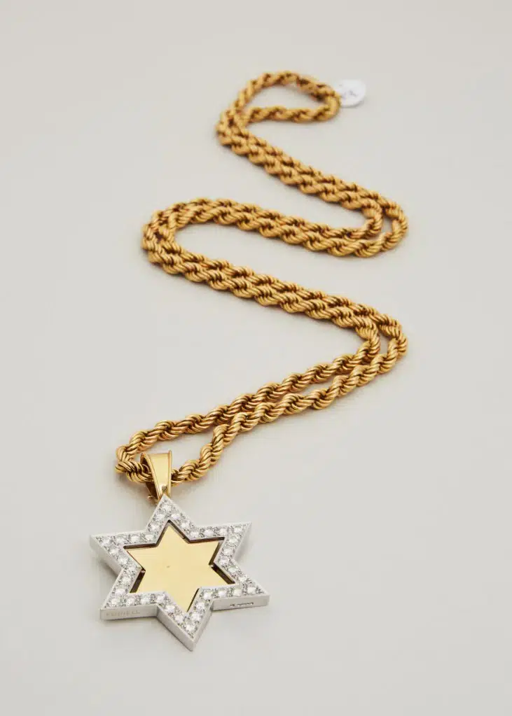 تم بيع قلادة نجمة داود الماسية والذهبية بالمزاد العلني كجزء من “Limelight Edit” لجوليان ، والذي يحتكم على مجموعة منسقة من القطع من شير ومارلين مونرو وفيكتوريا بيكهام وإيمي واينهاوس وغيرهم الكثير.