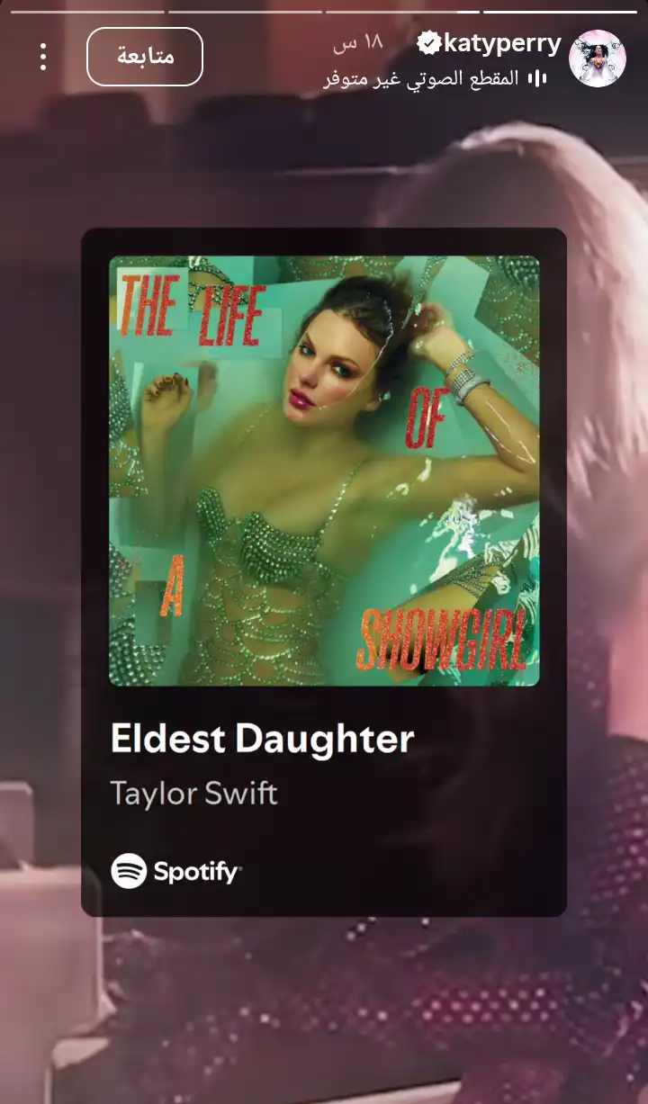 شاركت كاتي بيري، عبر خاصية “الستوري” في حسابها على منصة إنستغرام، لقطة شاشة أثناء استماعها إلى أغنية “Eldest Daughter” من ألبوم تايلور سويفت، معلقة: “أحبها كثيراً”.