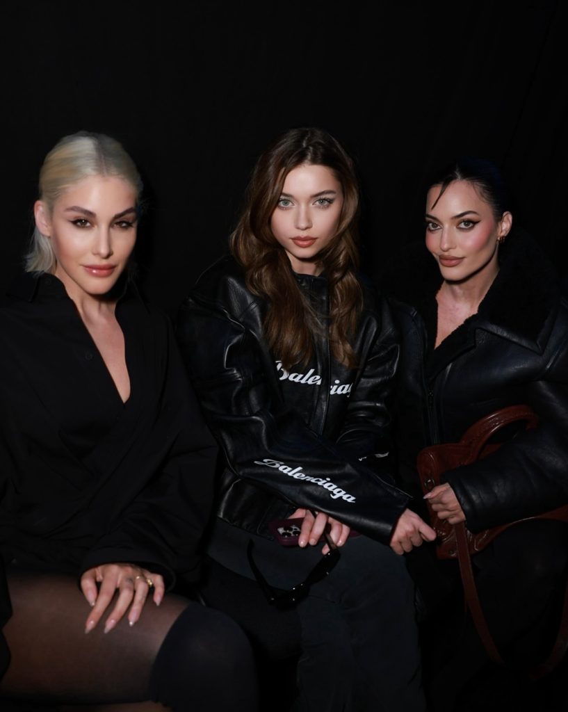 أما في عرض بالنسياغا فكانت لها إطلالة كاملة من الدار بالأسود من فيزون يكمش كامل الأرجل وجاكيت جلد سوداء قصيرة مع اكتاف عريضة وسكربينة مروسة سوداء وحقيبة كبيرة باللون البني الملمع. وجاءت التسريحة لشعر مشدود للخلف مع خط شعر رفيع على الجبين يبدو كعلامة التعجب. وقد اجتمعت خلال العرض بزميلات مؤثرات ونجمات مثل نور عضاضة والممثلة التركية عفراء أوغلي بطلة مسلسل “الطائر الرفراف”. والسيدات الثلاث تأنقن بالأسود خلال عرض بالنسياغا.