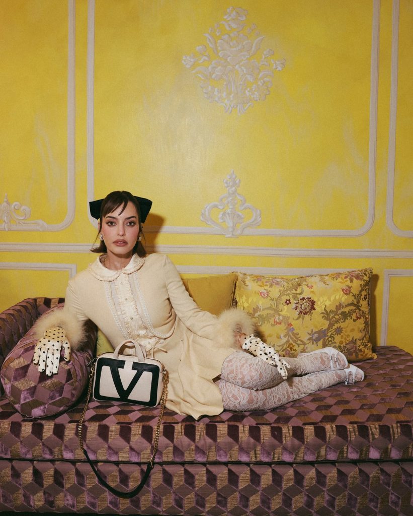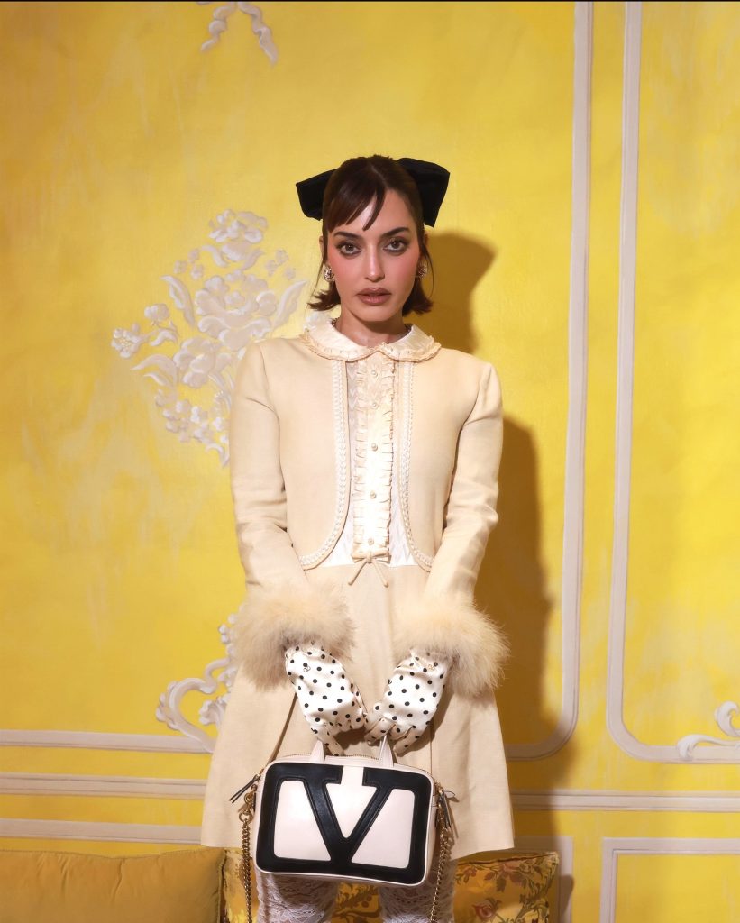 وفي عرض فالنتينو ارتدت أخر تقليعات الدار الرائجة بدلة باللون البيج كريمي مع قفازات متناغمة حريرية ومنقطة وحقيبة باللون والبيج مع علامة الدار المطبوعة باللون الأسود، واكتملت الإطلالة الطفولية بكولون من الشيفون البيج وحذاء صيفي مفرغ من الأمام بلون الهندام.