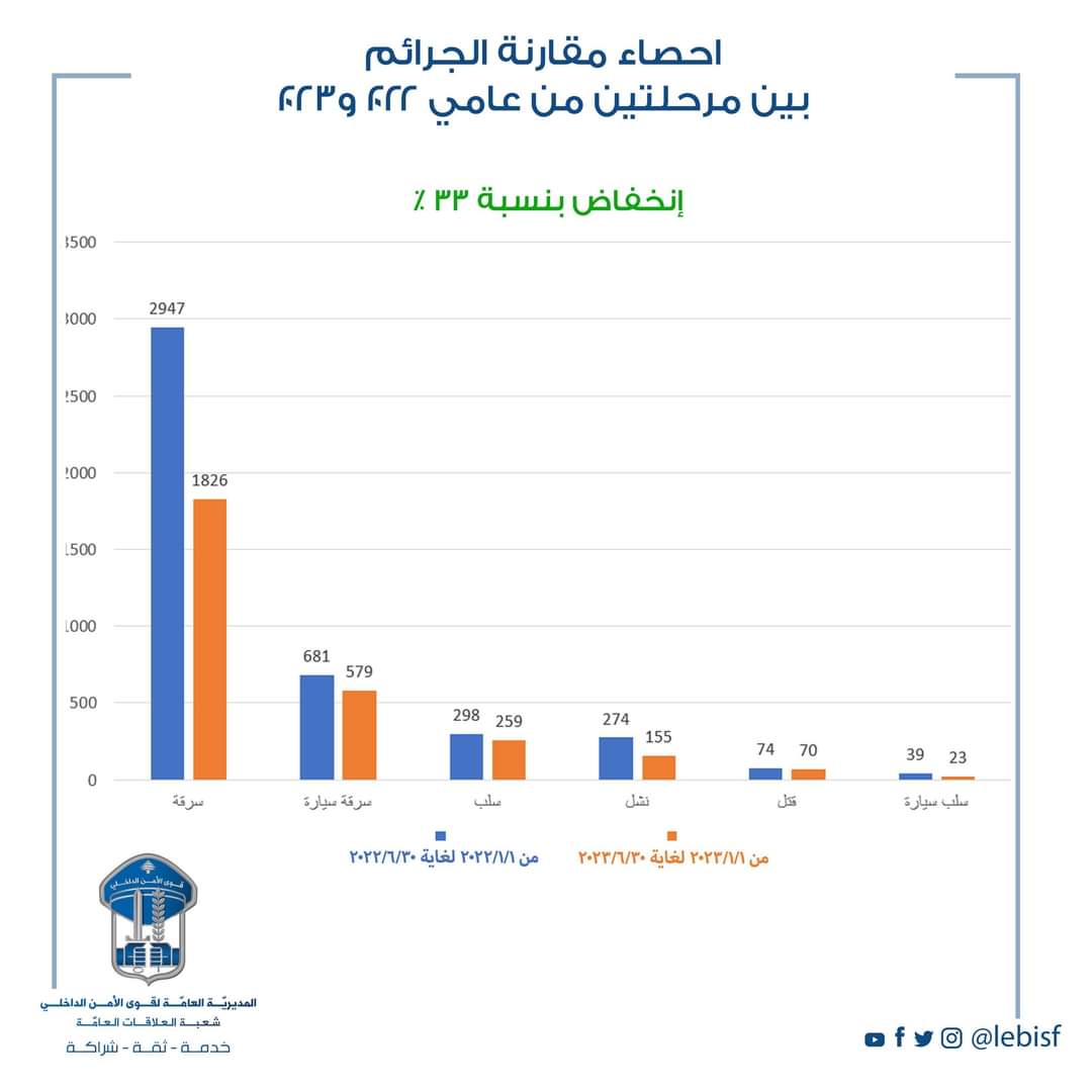 وصـدر عـن المديريّـة العامّـة لقـوى الأمـن الدّاخلـي بياناً تضمن جدولاً إحصائياً حول بعض الجرائم الهامّة (قتل، سلب، سرقة سيارات، سرقة موصوفة، نشل…) المرتكبة خلال النّصف الأوّل من العام 2023 ، بحيث يوضح تراجعاً ملحوظاً مقارنةً مع الأشهر ذاتها من العام المنصرم. كما جرى توقيف في خلال هذه الفترة /6,279/ شخصًا.