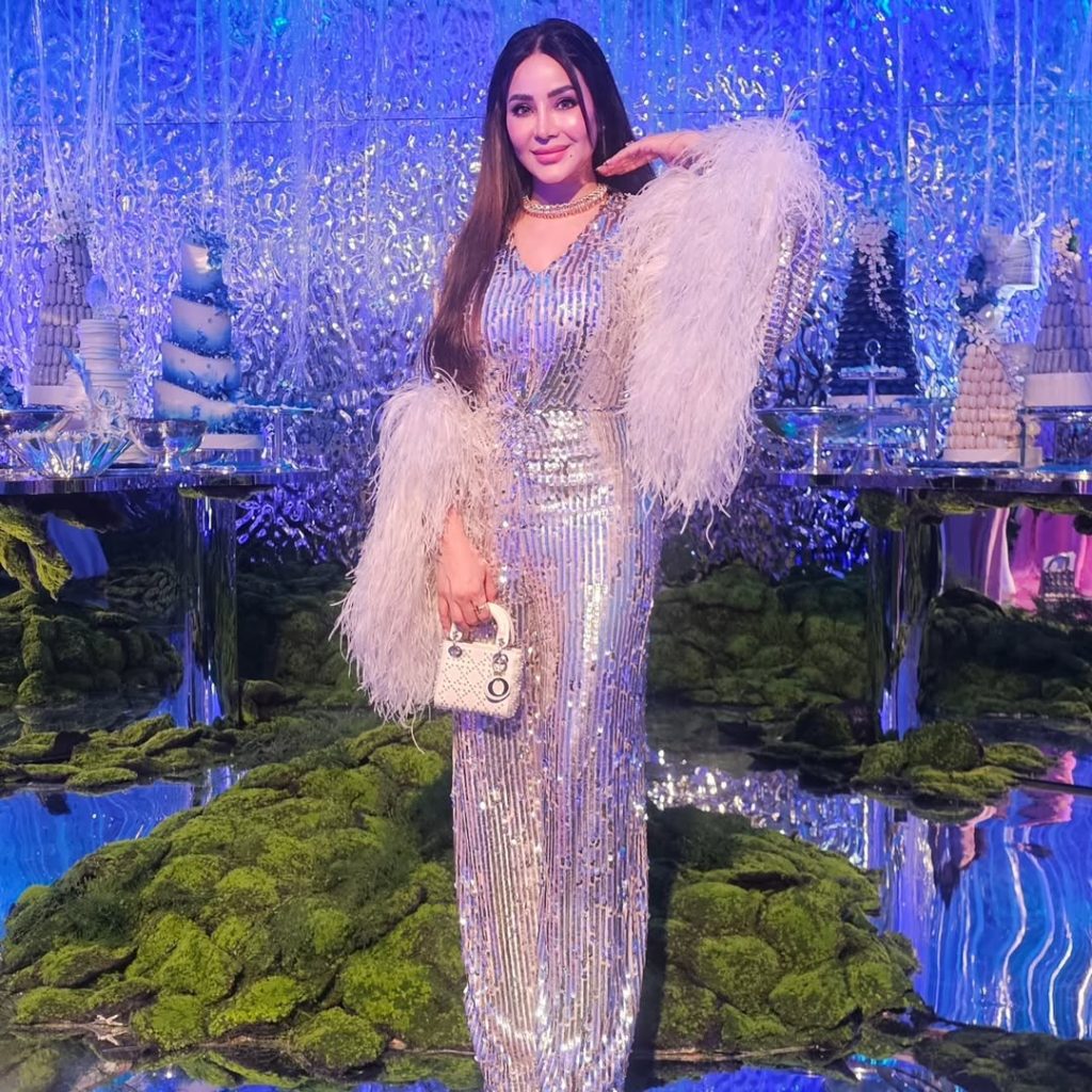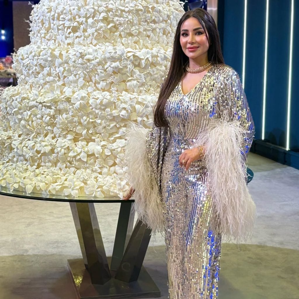 اختارت لجين جمبسوت براق، اشتغلت على تصميمه بما يلائم حضورها فمدت الاكمام ووزعت الريش وتركت البريق يحكي قصة التوهج في زفاف ملكي.