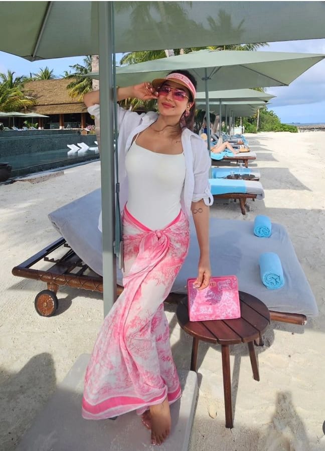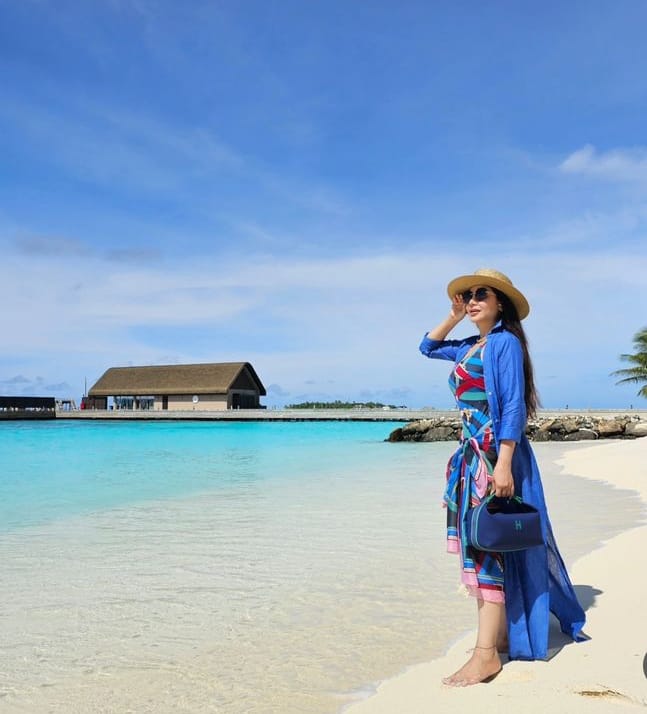 تنشر لجين عمران أناقتها في ظلال الصيف على بحر المالديف حيث تقضي أجازتها هناك.