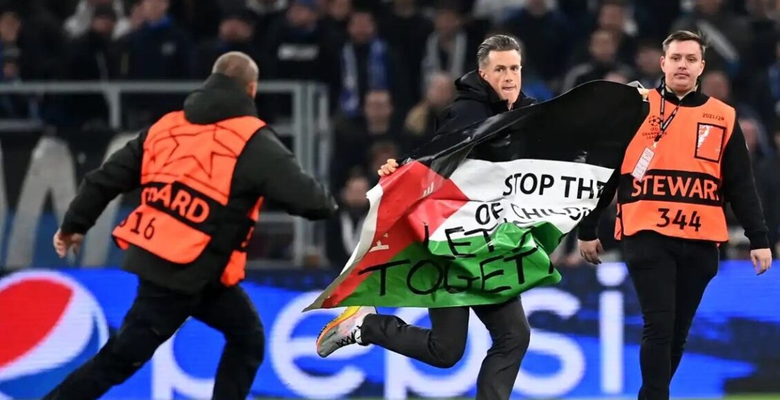 وبعد 9 دقائق من بداية المباراة، اقتحم المشجع أرضية الملعب، رافعاً العلم الفلسطيني، وكتب عليه باللغة الإنكليزية: “أوقفوا قتل أطفال غزة”.