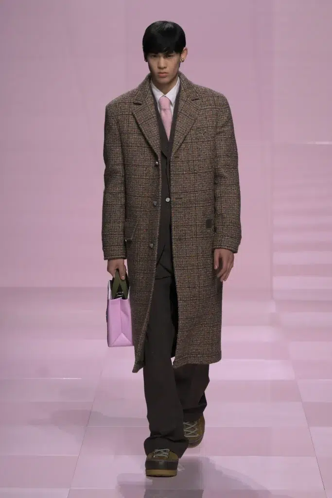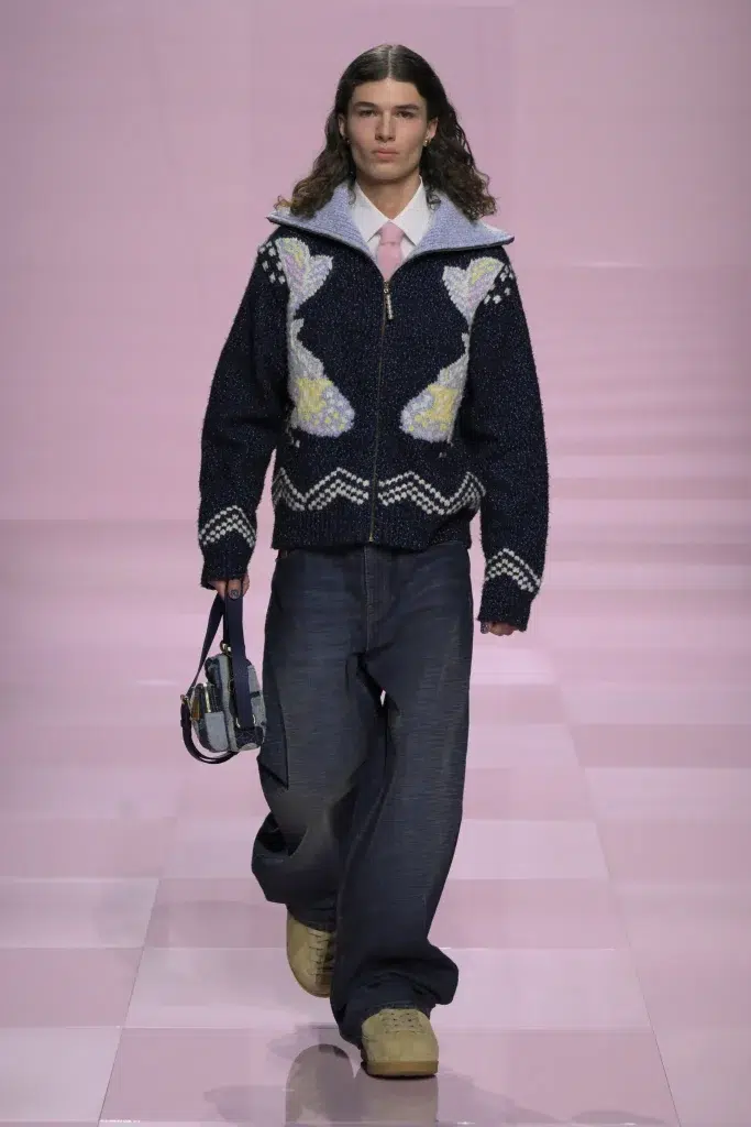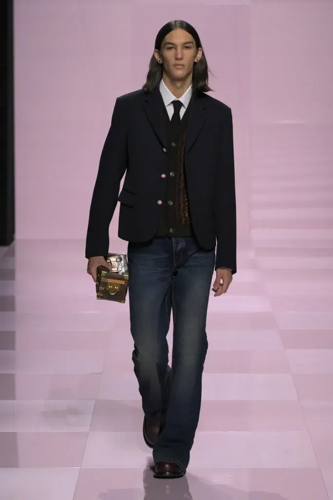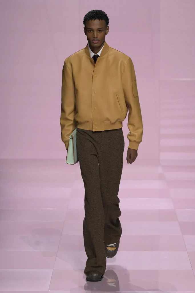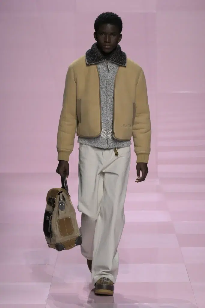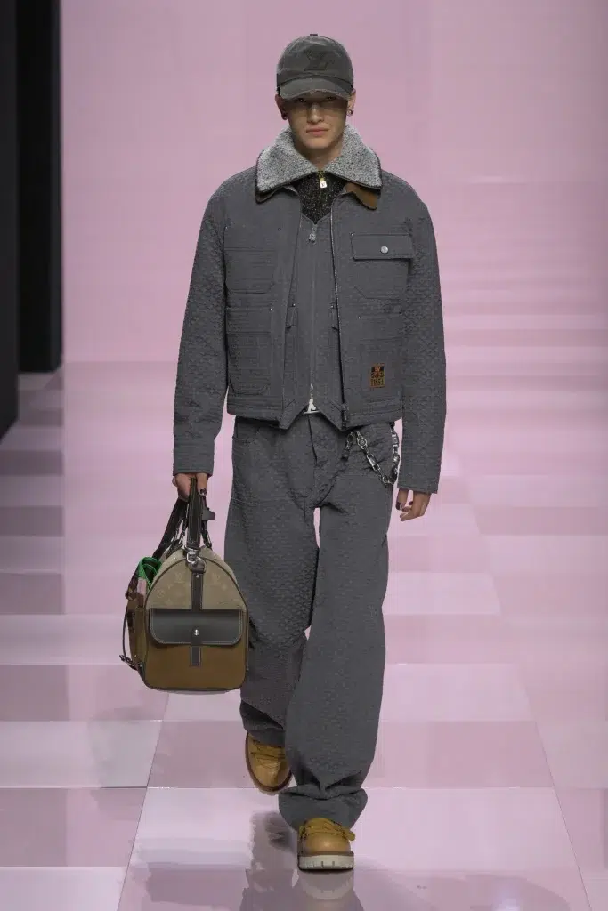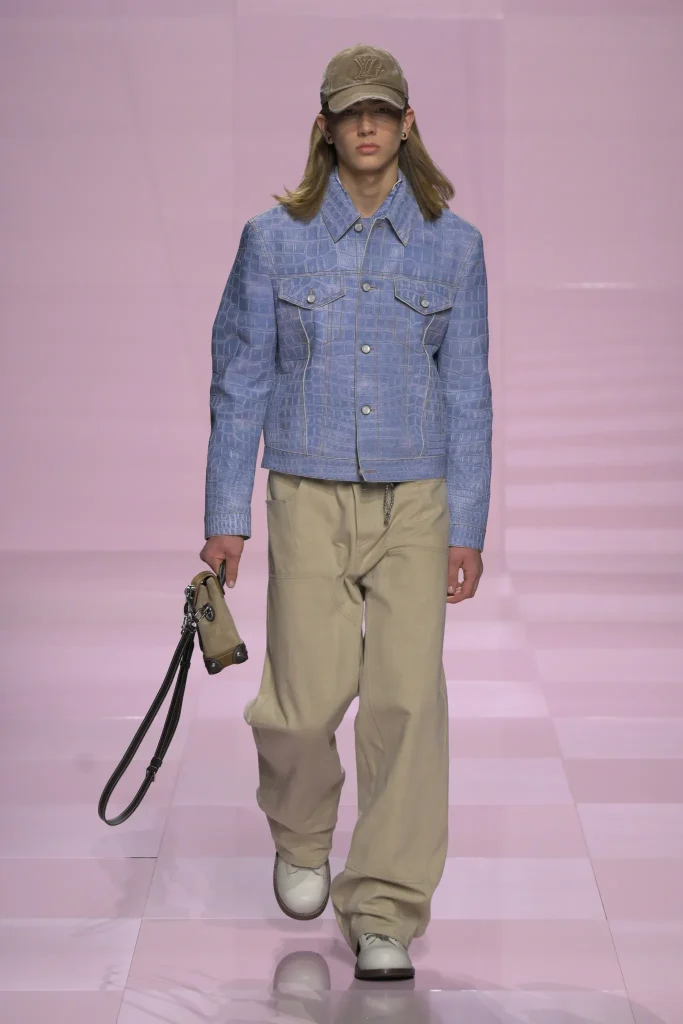 تم تبسيط السترات وتعديلها بتفاصيل غير عادية ، مثل الأكمام المصنوعة من الجلد الطبيعي غير المصبوغ المستخدم عادة في حقائب اليد من Vuitton ، والمصممة للحصول على الزنجار بمرور الوقت.