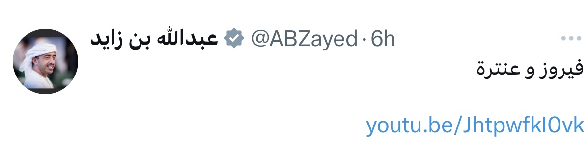نشر سمو الشيخ عبد الله بن زايد آل نهيان وزير الخارجية والتعاون الدولي  الإماراتي، عبر حسابه الرسميإكس (تويتر سابقا“) أغنية لفيروزلو كان قلبي معي، وأرفقها بتغريدةٍ جاء فيها : “فيروز وعنتره” ملمحاً إلى أن الأغنية تتألف من أبيات لقصيدة عنتره بن شداد.