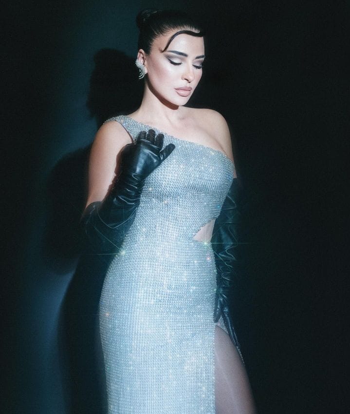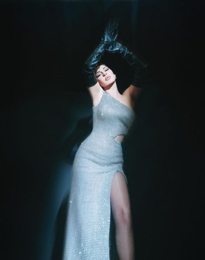 تتألق الفنانة ماغي بو غصن بطلة العيد بثوب ميتليك فضي ملاصق للجسم مع فتحة طويلة وقصة ناحية الخصر بدون أكمام. واكملت الطلة بشيء من الغموض مع قفازات سوداء طويلة.