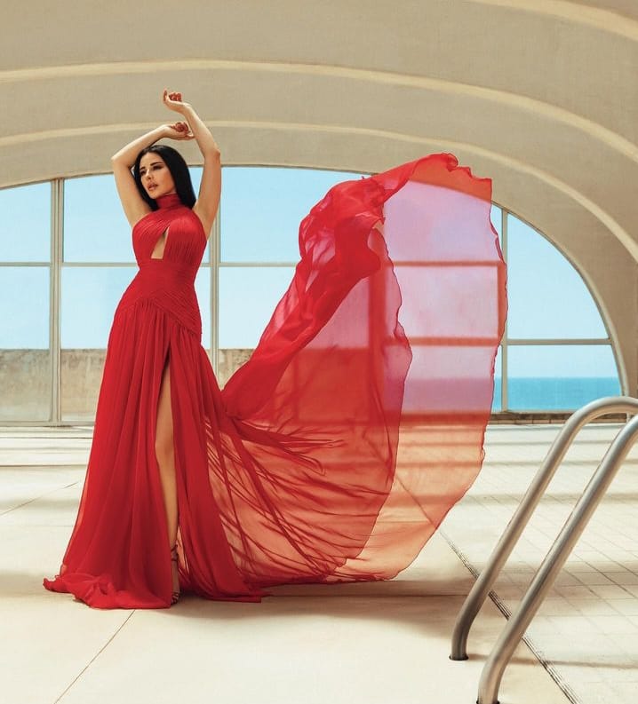 وترحل ماغي بوغصن نحو الرقص بثوب أحمر رقيق حريري يتطاير على حفافي الشبابيك قبالة شواطئ السفر من ابداع طوني ورد. ثوب عاري الكتفين مشقوق الصدر بحد سكين حاد. وفتحة طويلة تصل لأعلى الفخذ.