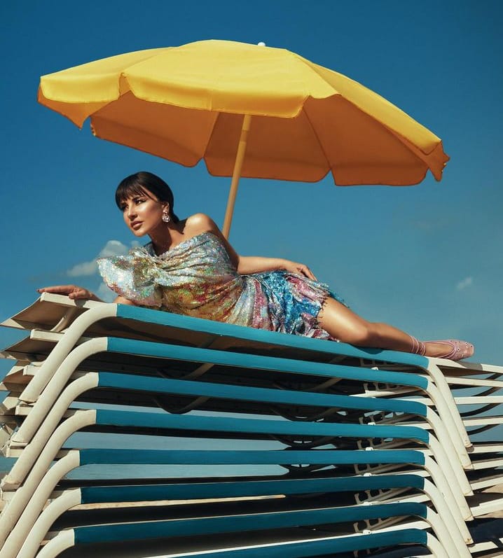 من رامي القاضي ارتدت ثوباً براقاً قصير متداخل الألوان كفيض ماء عكرة في بركة من ألوان. الطلة برونزية بامتياز وهي تتظلل تحت مظلة صفراء على أسرة الشواطئ المكدسة في صورة تبدو كشغب طفولي وعيونها ترنو على البعيد تتفحص ما هو قادم بنظرة ثاقبة.