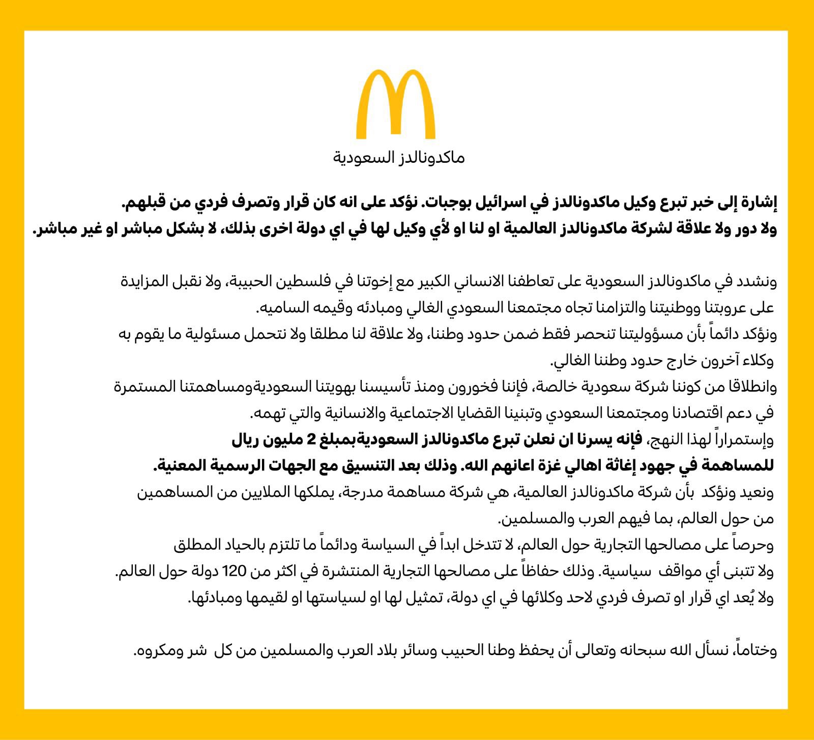 وكانت الشركة أصدرت بيانًا للرد على ما أثير حول دعم سلسلة المطاعم لقوات الاحتلال الإسرائيلي، قالت فيه: ماكدونالدز السعودية شركة ماكدونالدز العالمية هي شركة مساهمة لا يملكها شخص محدد بل يملكها ملايين من الأشخاص حول العالم بما فيهم عرب ومسلمون وتلتزم ماكدونالدز العالمية بالحياد وعدم تبني أي مواقف، سياسية وذلك حفاظا علی مصالحها التجارية حول العالم.