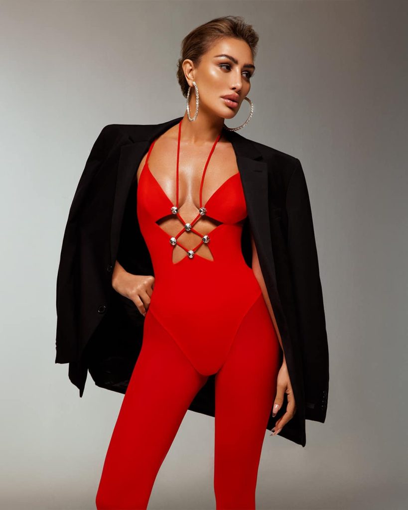 هذه الإطلالة المثيرة شغلت رواد التواصل الاجتماعي ودخلت في تعليقاتهم. كل شيء أحمر إلا بعض الترصيع بالكريستال البرّاق Embellished Star Cutout Bodysuit in Red، وقيمته المالية 695$، من علامة “آريا” (Area). انتعلت كذلك صندلاً بلون زيّها مع جوارب سميكة حمراء، وألقت على كتفيها سترة كلاسيكيّة سوداء.