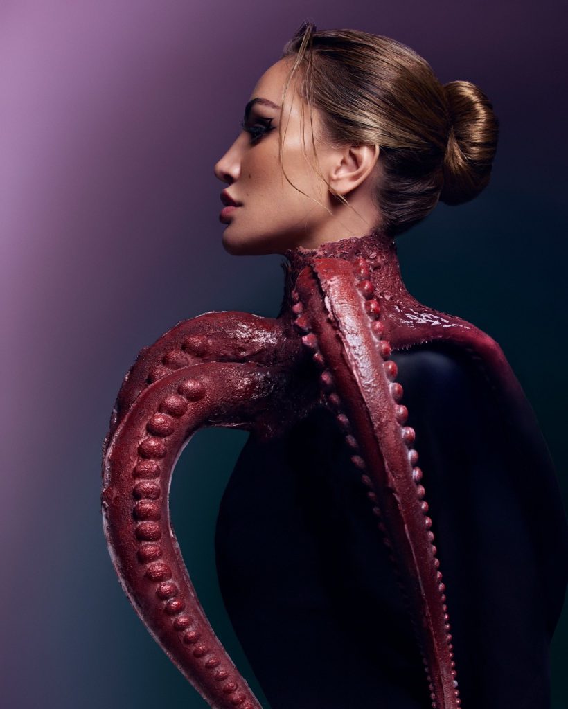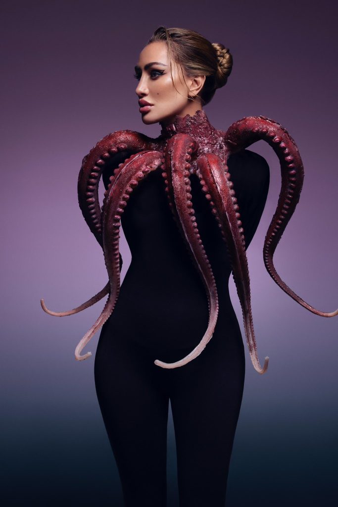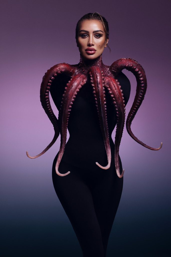 طلت مايا دياب بقلادة كبيرة على شكل أخطبوط تلتف حول عنقها وتتدلى أذرعه حول جسمها.