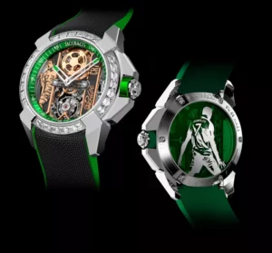 الساعة التي تبلغ قيمتها 117 ألف دولار أمريكي بحسب “Jacob & Co”، تُعتبر واحدة من الأربع ساعات المحدودة في مجموعة “Epic X Heart of CR7 Baguette”، وهي مرصعة ب 26 ماسة بيضاء. واحتفلت “Jacob & Co” بإطلاقها الذي تزامن مع افتتاح متجر الشركة الجديد في مدينة الرياض بالمملكة العربية السعودية، وحضره كرستيانو رونالدو المعروف بحبه للساعات.