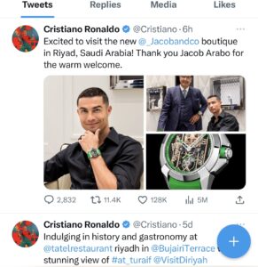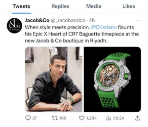 فيما رد عليه “جاكوب أرابو” بتغريدة قال فيها: “عندما يلتقي الأسلوب بالدقة. يتباهى بساعته Epic X Heart of CR7 Baguette في بوتيك Jacob & Co الجديد في الرياض“.