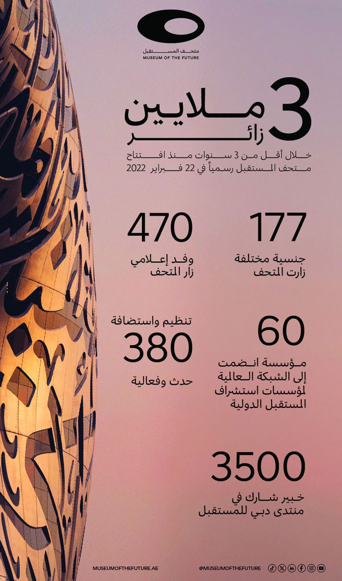 حقق متحف المستقبل في دبي إنجازاً عالمياً بارزاً بوصول عدد زوّاره إلى أكثر من ثلاثة ملايين زائر من 177 دولة حول العالم خلال أقل من ثلاث سنوات، منذ افتتاحه رسمياً في 22 فبراير 2022.