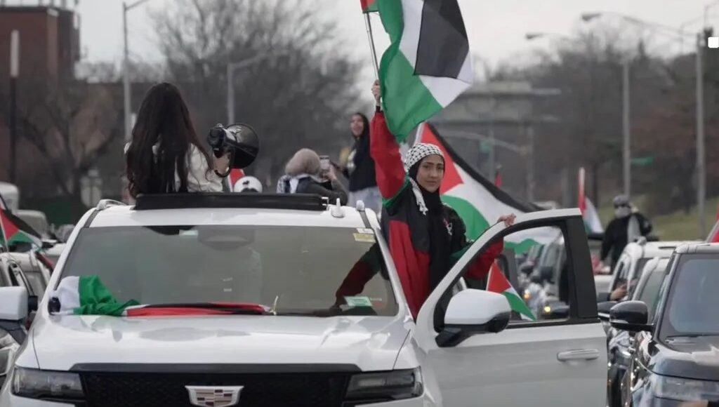 وأظهرت لقطات أخرى نُشرت على وسائل التواصل الاجتماعي أكثر من اثنتي عشرة سيارة تلوح بالأعلام الفلسطينية وتطلق أبواق السيارات على الطريق المزدحم قبل وقت قصير من المسيرة المخطط لها في الساعة الثانية بعد الظهر.