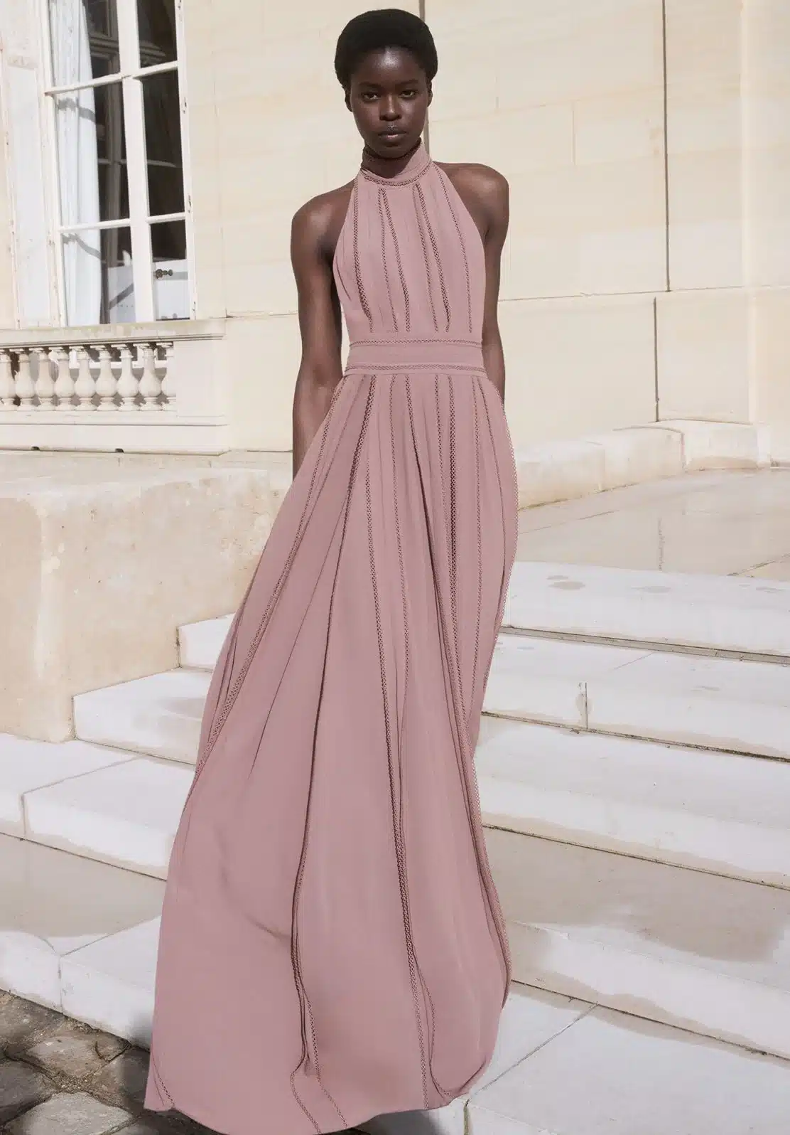 ويتدفق التطريز باللون الوردي والكابتشينو عبر الفساتين الشمسية والسراويل ذات الأرجل الواسعة التي تصل إلى الكاحل مع قميص بياقة متناسقة والتنانير ذات الطبقات الكاملة وفساتين الكوكتيل تهتز ويهتز فيها حبات الفضة والذهب الكهربائية.