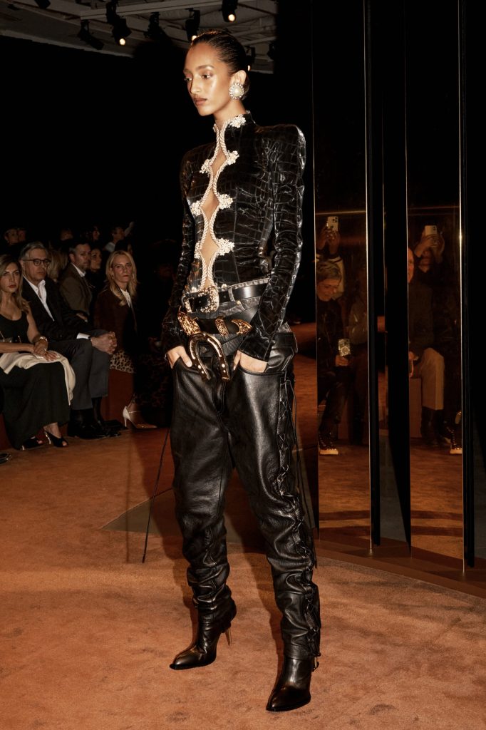 بدت المجموعة متوترة من خلال الخياطة الحادة والنعومة غير المتوقعة ، والأشكال الجلدية الصلبة التي تتحرك بسهولة مدهشة ، والإكسسوارات الجريئة التي شعرت وكأنها دروع أكثر من كونها للزينة.. كانت الملابس الخارجية قيادية ، مع سترات قوية الأكتاف وأحزمة نحتية تؤكد على الهيكل والحماية ، ومع ذلك كانت هناك سيولة متعمدة في الجلد المدبوغ الملفوف والتنانير الكاسحة التي خففت من الموقف العام للمجموعة.
