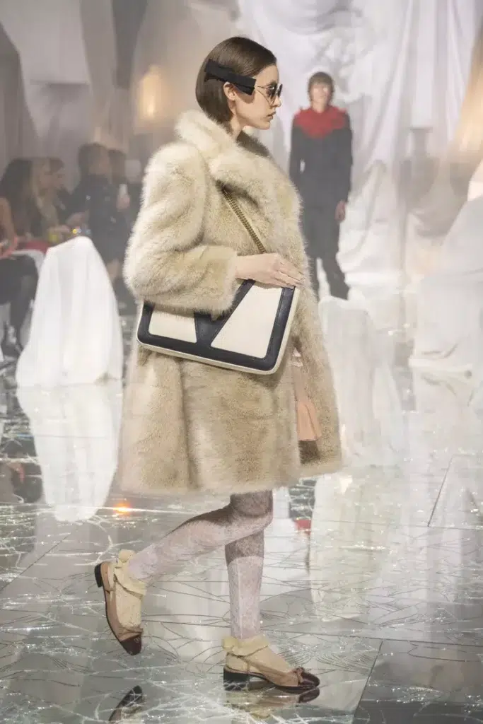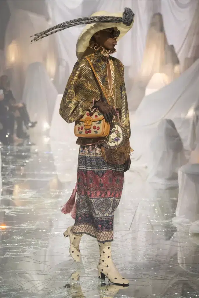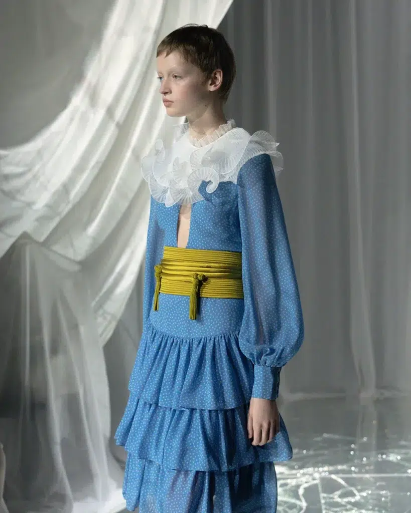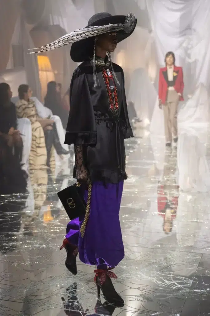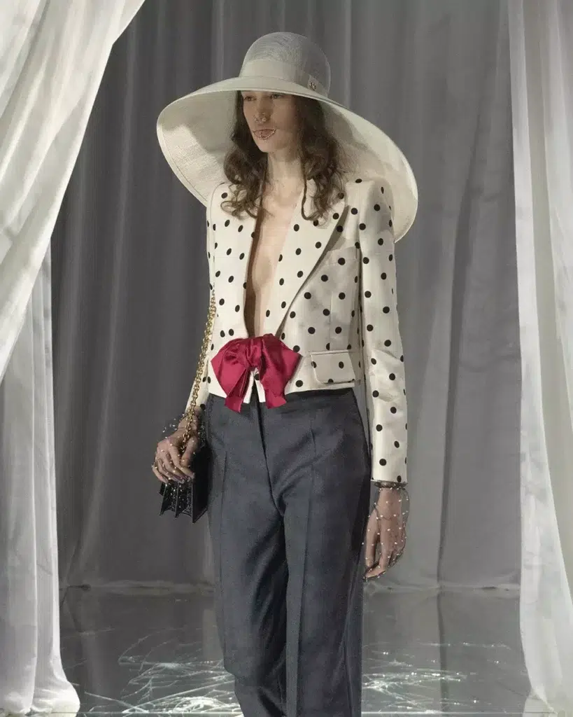 المجموعة بضوضائها وعبثيها، تقطر بتفاصيل الأزياء الراقية. تزين تطريزات ميشيل الفخمة المميزة فساتين سوداء شفافة مع نقاط مزخرفة تتلألأ تحت الأضواء ، وقبعات كبيرة ذات ريش زائد وفرو مزيف تثير إحساسا بالدراما المرحة. ظهرت الأقواس في أماكن غير متوقعة – كبيرة ومنحوتة ، أو لهجات رقيقة من الفراء الصناعي مع ريش أسود إمبراطوري ، تعيد تخيل جوهر فالنتينو. كانت كل قطعة عبارة عن حوار بين الرموز الكلاسيكية للمنزل وإعادة تفسير ميشيل.