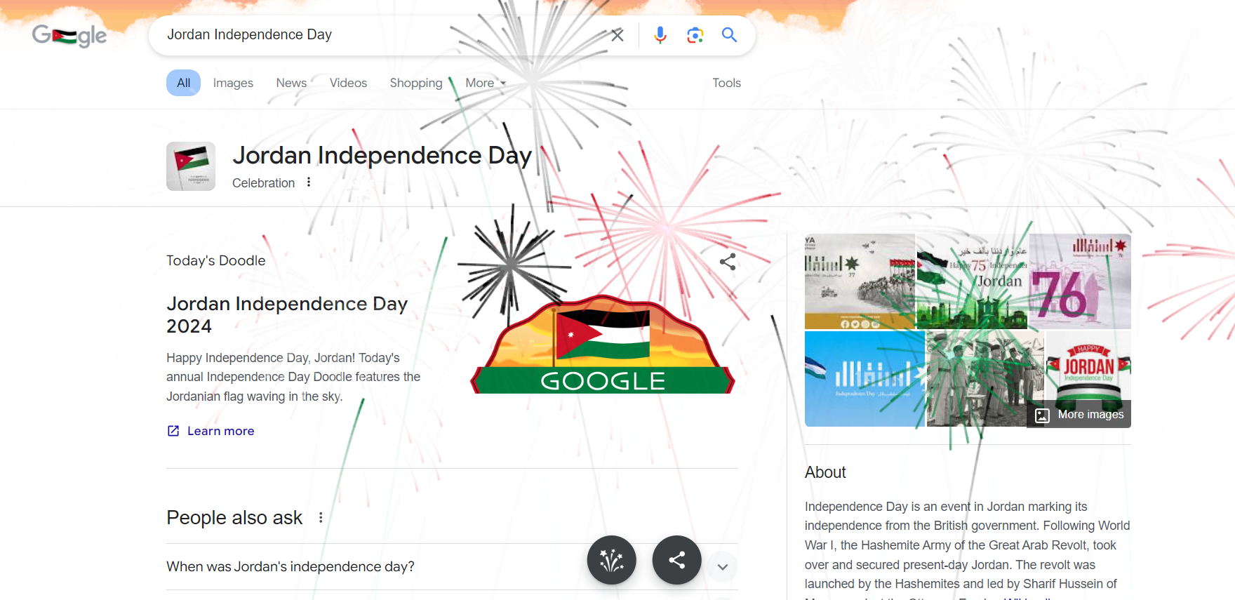 احتفل محرك البحث الشهير “غوغل”، اليوم السبت، بعيد استقلال الأردن الـ 78.