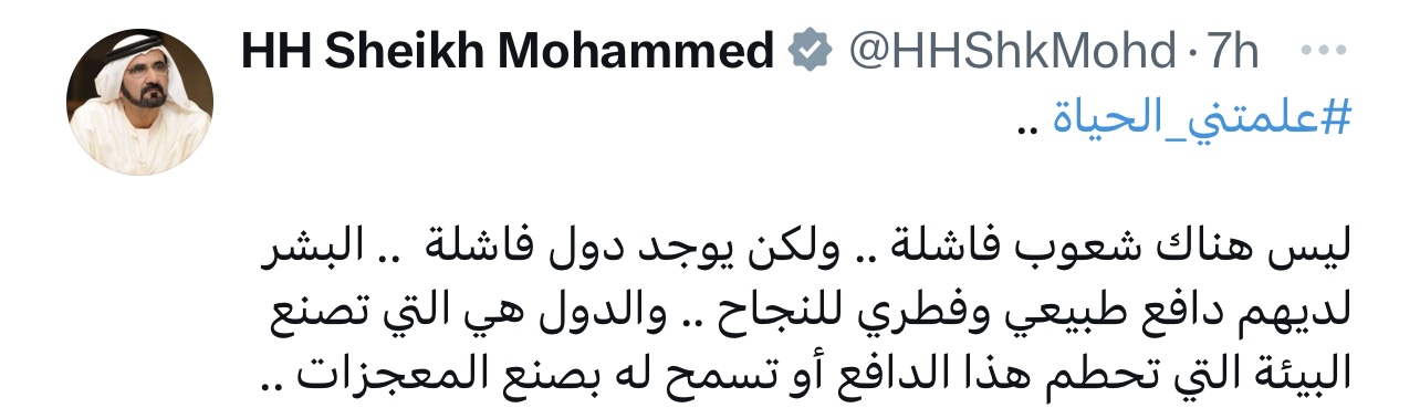 تحت هاشتاغعلمتني الحياة، أعرب صاحب السمو الشيخ محمد بن راشد آل مكتوم نائب رئيس دولة الإمارات العربية المتحدة، رئيس مجلس الوزراء حاكم دبي، أنه لا توجد هناك شعوب فاشلة، ولكن يوجد دول فاشلة، كون أن البشر لديهم دافع طبيعي وفطري للنجاح، فيما أن الدول هي التي تصنع البيئة التي تحطم هذا الدافع أو تسمح له بصنع المعجزات.