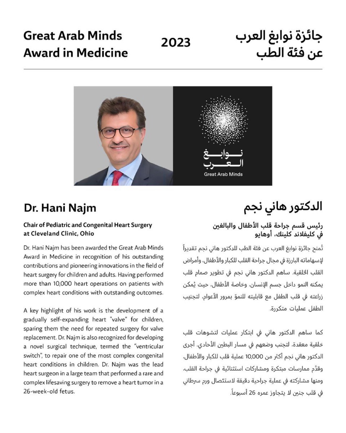 وجاء في تدوينة صاحب السمو الشيخ محمد بن راشد آل مكتوم: “أطلقنا قبل عام مبادرة “نوابغ العرب” .. بهدف تكريم العلماء العرب .. والاحتفاء بالعقول العربية .. وتحفيز المبدعين العرب .. في قطاعات كالطب والهندسة والاقتصاد والأدب والفنون وغيرها .. فكما يحتفى العالم بالعلماء في جائزة نوبل نحتفي بالعلماء العرب في هذه الجائزة .. لتكون نوبل العرب.. واليوم نعلن أول الفائزين في جائزة “نوابغ العرب” في مجال الطب وهو الدكتور هاني نجم من المملكة العربية السعودية رئيس قسم جراحة القلب للأطفال والبالغين بمستشفى كليفلاند كلينك بالولايات المتحدة .. والذي تخصص في الجراحة القلبية للأطفال والكبار واستحدث ممارسات جراحية مبتكرة واستثنائية عبر ١٠ آلاف عملية قلب أجراها”.